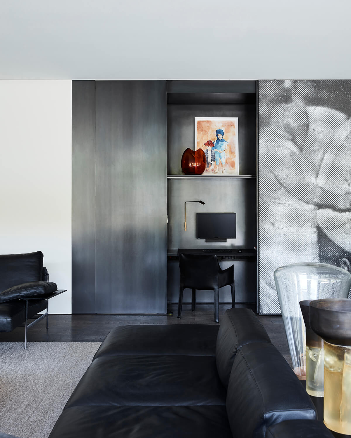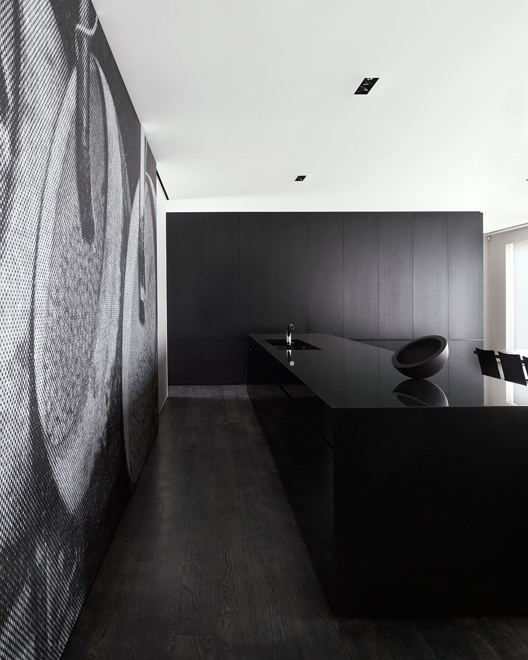 At the centre of the kitchen, a monolithic stone island bench is framed by a large format printed image of the original factory vats, a fully operable piece of joinery slide that elegantly slides to conceal kitchen amenity when not use.